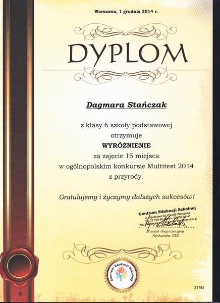 Dnia 11 czerwca 2015 roku, reprezentacja naszej szkoły w składzie Karolina Taborska klasa 6d, Marta Hała klasa 5d uczestniczyła w konkursie „ABC – nie zawsze chodzi o alfabet”, obejmującym zagadnienia z zakresu przedmiotu przyrody oraz udzielania pierwszej pomocy. Zwycięzcy zostali wyłonieni po pięciu konkurencjach praktyczno- teoretycznych. Konkurs odbył się w Gimnazjum nr 6 w Poznaniu, natomiast rozdanie nagród miało miejsce 18 czerwca 2015 roku w Zespole Szkół Handlowych na ul. Śniadeckich 54/58 w Poznaniu. Serdeczne podziękowania dla Pani Alicji Dubel za przygotowanie, motywację i dobro słowo, Pani pielęgniarce za pomoc w nauce i zajęcia praktyczne.