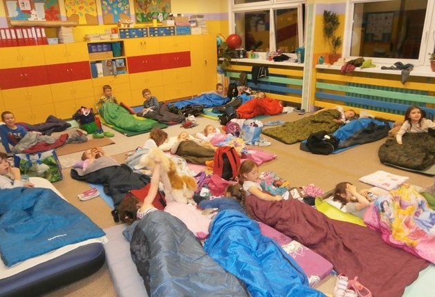 Uczniowie klasy 1c mieli okazje zobaczyć jak wygląda szkoła nocą. W majowy wieczór wszyscy stawili się w szkole ze śpiworami, materacami, poduszkami i pluszakami do spania. Najpierw uczniowie brali udział w grze terenowej, której tematem przewodnim były przygody Kubusia Puchatka. Zadaniem dzieci było odnalezienie jego zaginionego miodku. Nagrodą w poszukiwaniach były bransoletki, które świecą w ciemności. Gdy emocje opadły mogliśmy spokojnie zjeść kolację i rozgościć się w naszej sali.
