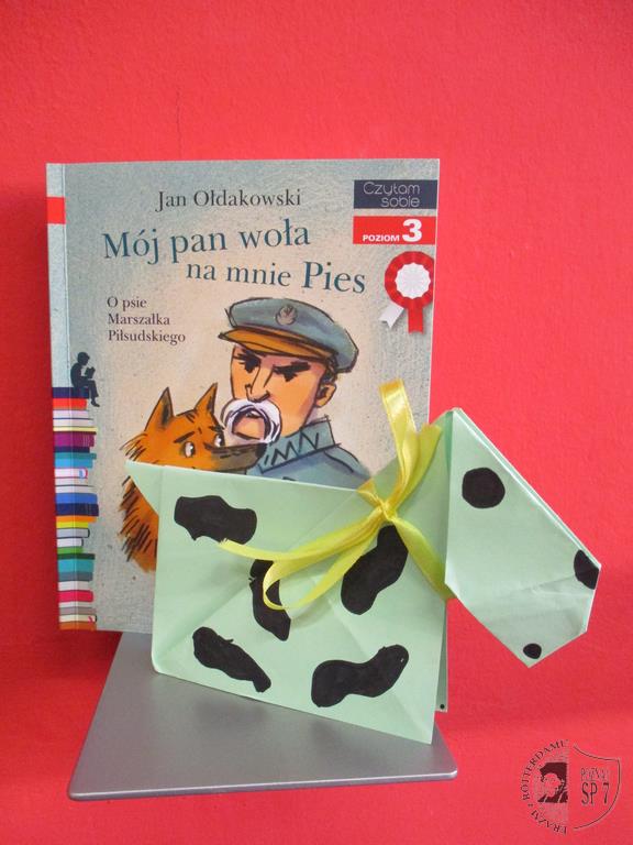 Podczas spotkania Szkolnego Koła Miłośników Książek poznaliśmy niezwykłą książkę, którą napisał dyrektor Muzeum Powstania Warszawskiego pan Jan Ołdakowski. Książka nosi tytuł Mój pan woła na mnie Pies. O psie Marszałka Piłsudskiego i została wydana z okazji 100 rocznicy odzyskania przez Polskę niepodległości. Jest to zabawna, detektywistyczna historia opowiedziana z perspektywy ukochanego wilczura Marszałka. Książka stała się inspiracją do wykonania piesków techniką origami.