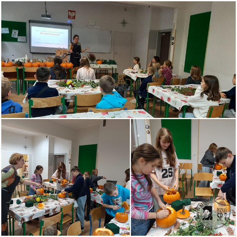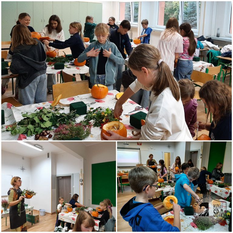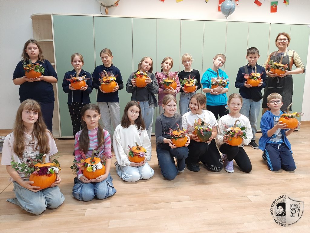 8 października 15 uczniów z klas 4-6 wzięło udział w warsztatach florystycznych zorganizowanych przez szkolną bibliotekę. Spotkanie poprowadziła pani Agnieszka Góralska-Owczarzak, która swoją niezwykłą pasją zaraża dzieci i dorosłych. Uczniowie dowiedzieli się, czym zajmuje się florystyka oraz jakimi narzędziami posługuje się osoba wykonująca roślinne dekoracje. Główną bohaterką spotkania była dynia, ale dzieci miały również okazję poznać różne rodzaje jesiennych kwiatów, krzewów oraz pnączy. Przygotowanie dyniowych dekoracji wymagało wiele wysiłku i pracy, jednak uczniowie poradzili sobie znakomicie. Stworzone przez nich kompozycje zachwycały pomysłowością i starannością wykonania.