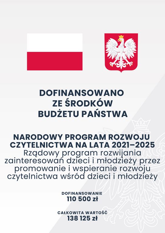Miasto Poznań otrzymało w 2021 roku dofinansowanie z tytułu realizacji rządowego programu pn. „Narodowy Program Rozwoju Czytelnictwa na lata 2021-2025„. Program przeznaczony jest na dofinansowanie zadania polegającego rozwijaniu zainteresowań dzieci i młodzieży przez promowanie i wspieranie rozwoju czytelnictwa wśród dzieci i młodzieży, realizowanego w ramach Priorytetu 3 „Zakup nowości wydawniczych do placówek wychowania przedszkolnego, bibliotek szkolnych i pedagogicznych” (Kierunek interwencji: 3.1. „Zakup nowości wydawniczych do placówek wychowania przedszkolnego” oraz Kierunek interwencji: 3.2. „Zakup nowości wydawniczych oraz elementów wyposażenia do bibliotek szkolnych i pedagogicznych”). Dotacja dla Miasta Poznania z budżetu państwa z tytułu realizacji tego programu wynosi: 110.500,- Całkowita wartość programu wynosi natomiast 138.125.