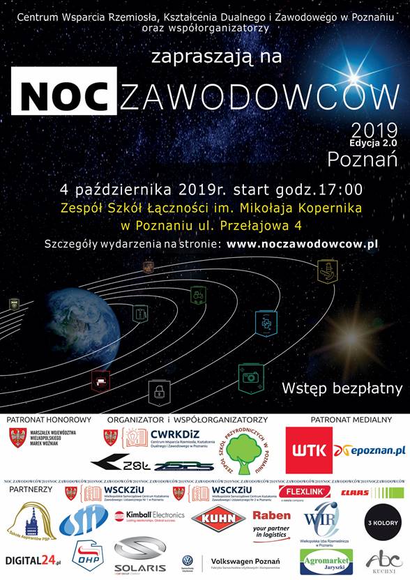 W związku z nadchodzącym Wydarzeniem Noc Zawodowców 2019, organizowanym przez Centrum Wsparcia Rzemiosła, Kształcenia Dualnego i Zawodowego w Poznaniu, serdecznie zapraszamy do aktywnego udziału w powyższym przedsięwzięciu młodzież, rodziców oraz nauczycieli, którzy zainteresowani są tematyką wyboru zawodu.