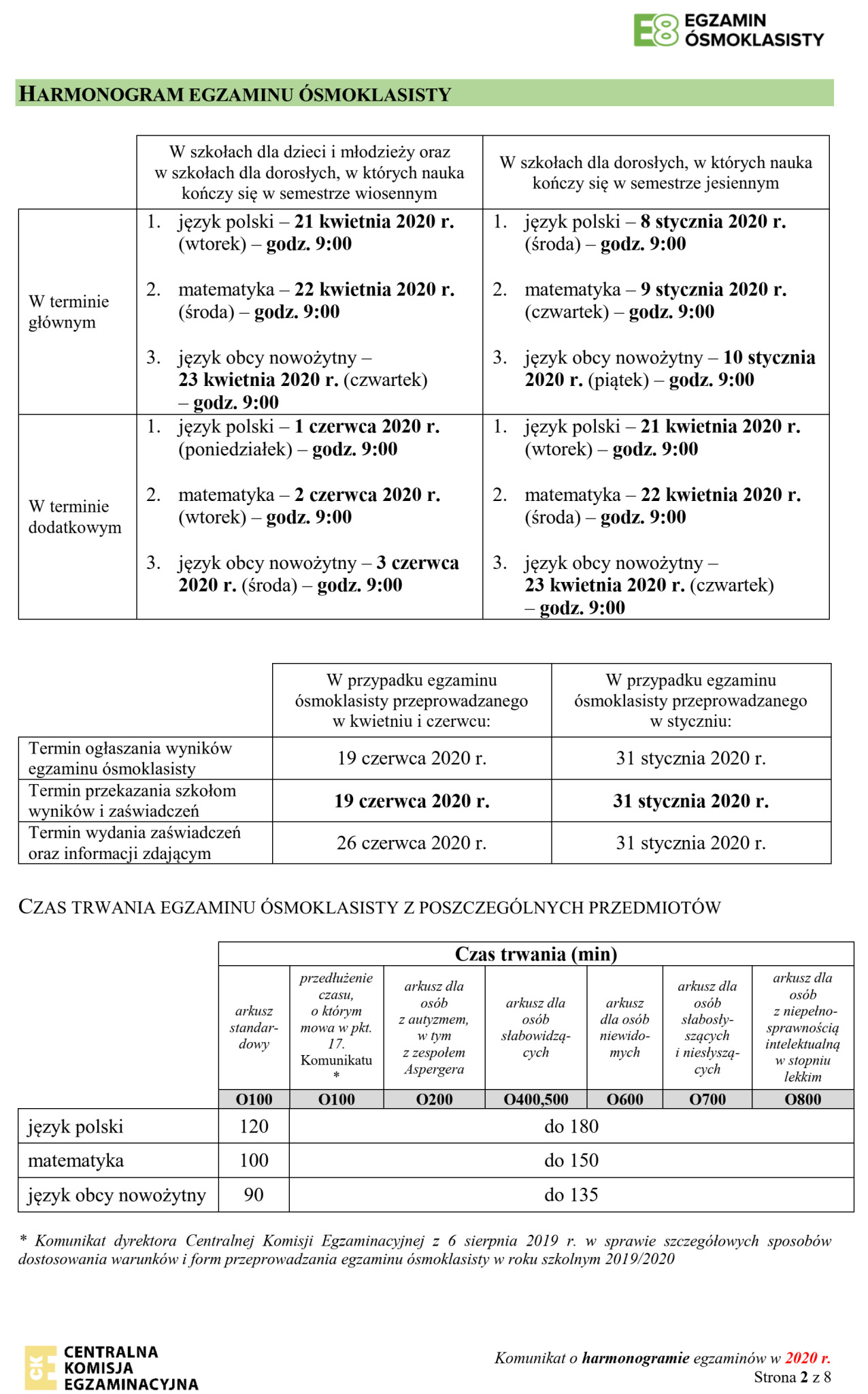 Wobec braku możliwości określenia, do jakiego momentu będzie konieczne ograniczenie funkcjonowania szkół, w dniu 10 kwietnia Minister Edukacji Narodowej wydał rozporządzenie, w którym zezwala dyrektorowi Centralnej Komisji Egzaminacyjnej na wprowadzenie w tym roku szkolnym zmian w harmonogramie przeprowadzenia egzaminów ósmoklasisty.