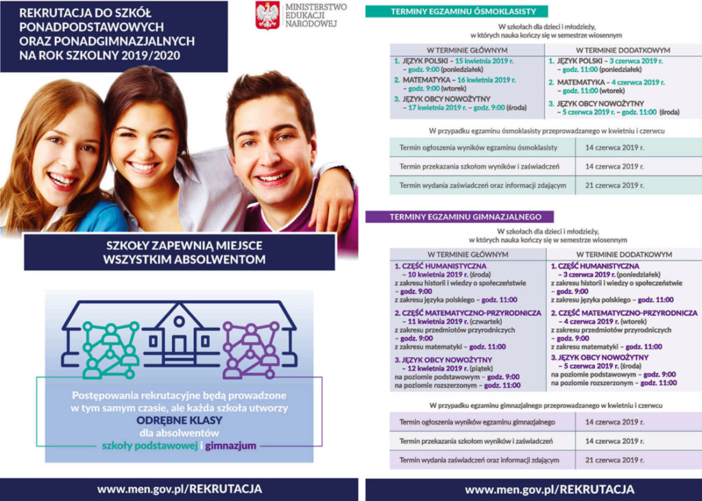 Zwracamy się z uprzejmą prośbą o przekazanie Rodzicom uczniów klas VIII szkoły podstawowej i III gimnazjum materiałów informacyjnych dotyczących rekrutacji do szkół ponadpodstawowych i ponadgimnazjalnych w roku szkolnym 2019/2020 przygotowanych przez Ministerstwo Edukacji Narodowej. Znajdują się w nich zasady naboru do klas pierwszych. Naszym wspólnym celem jest upowszechnianie wiedzy na temat rekrutacji.