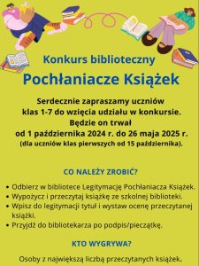 Organizator: Izabela Jarosz, Urszula Rataj Adresat: uczniowie klas 1-7 w SP7, Zadanie: przeczytanie jak największej liczby książek ze szkolnej biblioteki Cele: promocja czytelnictwa, utrwalanie nawyku czytania książek, podnoszenie kultury czytelniczej uczniów, zachęcenie do czytania książek spoza kanonu lektur obowiązkowych. Termin: od 1 października 2024 r. do 26 maja 2025 roku (dla uczniów klas pierwszych od 15 października).