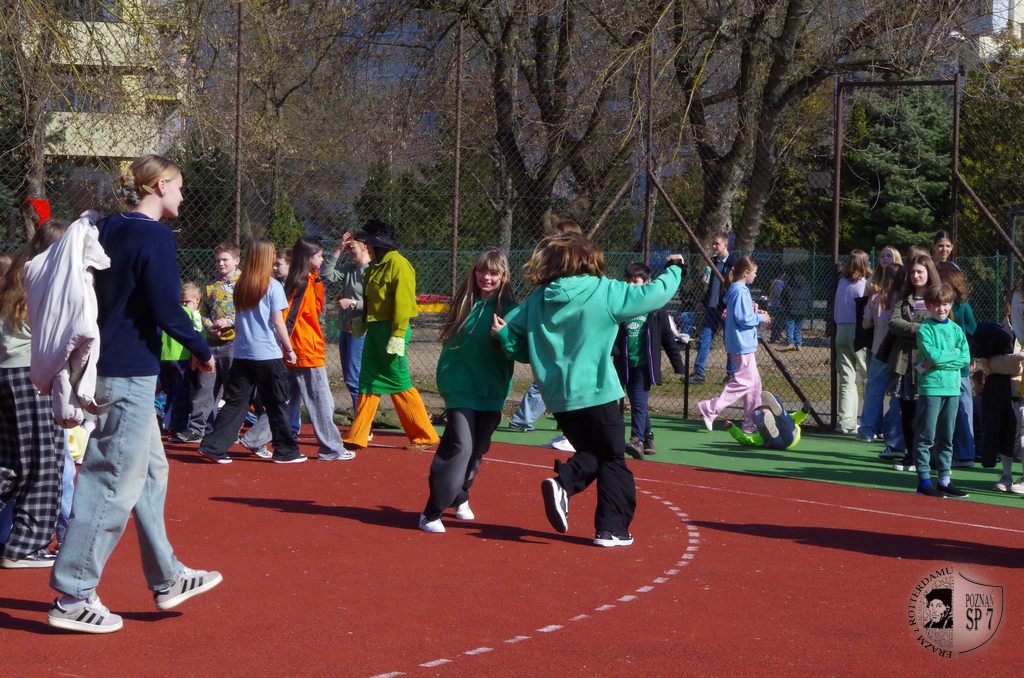 21 marca Mały i Duży Samorząd Uczniowski zaprosiły całą społeczność Siódemki do radosnego powitania pierwszego dnia kalendarzowej wiosny. Wydarzenie odbyło się na szkolnym boisku. Wielu naszych uczniów założyło tego dnia barwne ubrania, symbolizujące rozmaitość kolorów, jakie pojawiają się w przyrodzie wraz z nową porą roku.