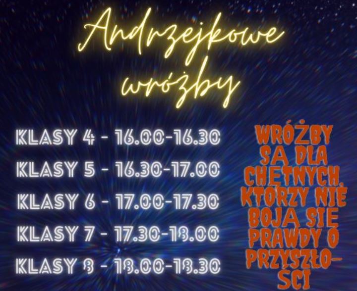 W czwartek 22 listopada w holu głównym szkoły odbyła się dyskoteka andrzejkowa dla wszystkich chętnych uczniów z klas 6-8. Zabawa rozpoczęła się o godzinie 17:00 i trwała do godziny 19:00. Organizacją imprezy zajął się Samorząd Uczniowski.