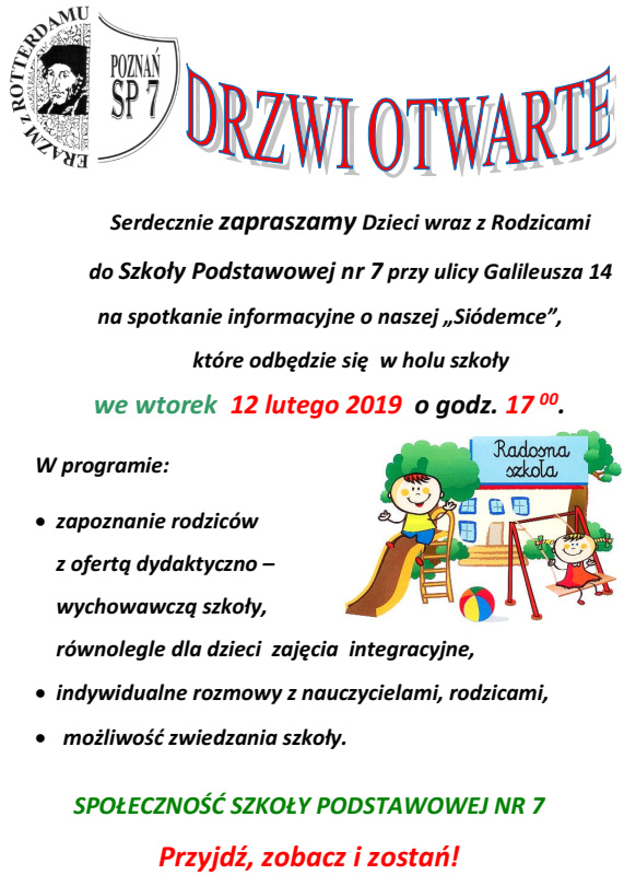 We wtorek, 12 lutego w naszej szkole odbyły się Drzwi Otwarte dla dzieci i rodziców. Goście przybyli na spotkanie zajęli miejsca w holu. Wszystkich zebranych, dyrekcję szkoły, zaproszonych rodziców klas 2 i 3 oraz nauczycieli naszej szkoły powitała pani Katarzyna Ryfa – pedagog szkolny i nauczyciel edukacji wczesnoszkolnej. Na początku przedstawiła plan spotkania. Następnie zwróciła się do najmłodszych uczestników Drzwi Otwartych. Dla nich zostały przygotowane zagadki, które były takim małym siódemkowym egzaminem.