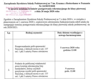 Na podstawie zarządzenia nr 67/2020/P Prezydenta Miasta Poznania z dnia 30 stycznia 2020r. ustalone zostały terminy postępowania rekrutacyjnego ustalenia terminów przeprowadzenia postępowania rekrutacyjnego oraz postępowania uzupełniającego na rok szkolny 2020/2021 do klas siódmych dwujęzycznych publicznych szkół podstawowych prowadzonych przez Miasto Poznań.