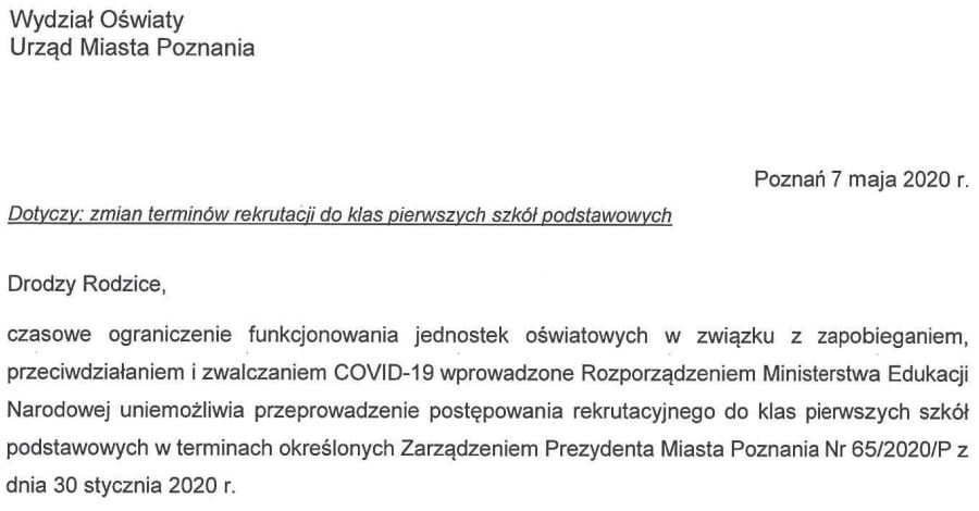 List z Wydziału Oświaty dot. zmian terminów rekrutacji do klas pierwszych