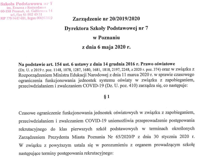 Na podstawie Zarządzenia nr 65/2020/P Prezydenta Miasta Poznania z dnia 30 stycznia 2020r. ustalone zostały terminy przeprowadzenia postępowania rekrutacyjnego i postępowania uzupełniającego, w tym terminów składania dokumentów na rok szkolny 2020/2021, do publicznych przedszkoli, oddziałów przedszkolnych w publicznych szkołach podstawowych oraz do klas pierwszych publicznych szkół podstawowych prowadzonych przez Miasto Poznań.