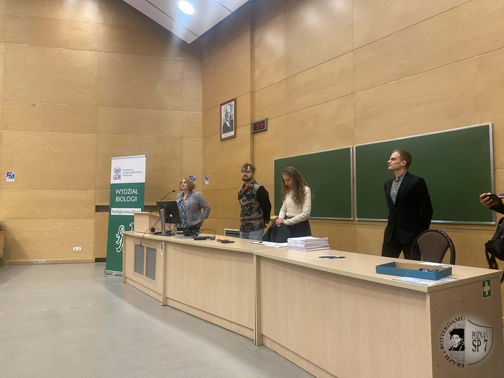 Cztery osoby stoją na podium sali wykładowej z zielonymi tablicami i banerem Wydziału Biologii.