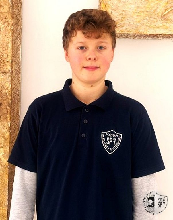 Chłopak z krótkimi kręconymi włosami ubrany w granatową koszulkę z białym emblematem poznańskiej szkoły SP7.