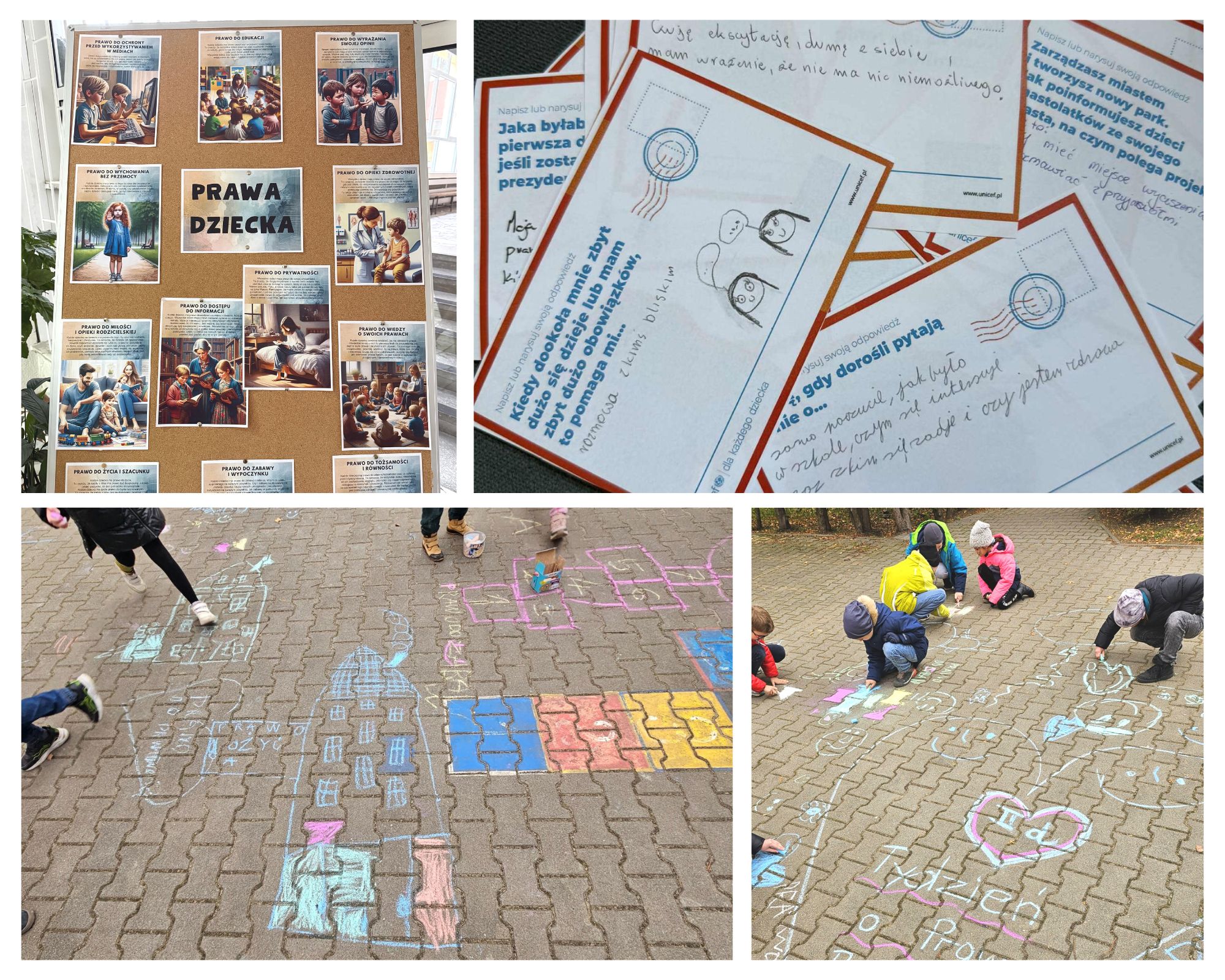 Dzieci bawią się i rysują kredą na zewnątrz; plakaty i karty dotyczące praw dziecka są wywieszone w pobliżu.