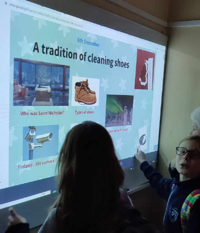 O tradycji czyszczenia butów, kim był św. Mikołaj, gdzie na mapie odnajdziemy Finlandię i wizyta w miasteczku Rovaniemi poprzez łączenie z kamerą online o tym wszystkim mówiliśmy podczas anglojęzycznego warsztatu związanego z Mikołajkami obchodzonymi w Polsce 6 grudnia. Poznaliśmy także nazwy różnych rodzajów butów oraz otwieraliśmy wirtualne prezenty!