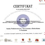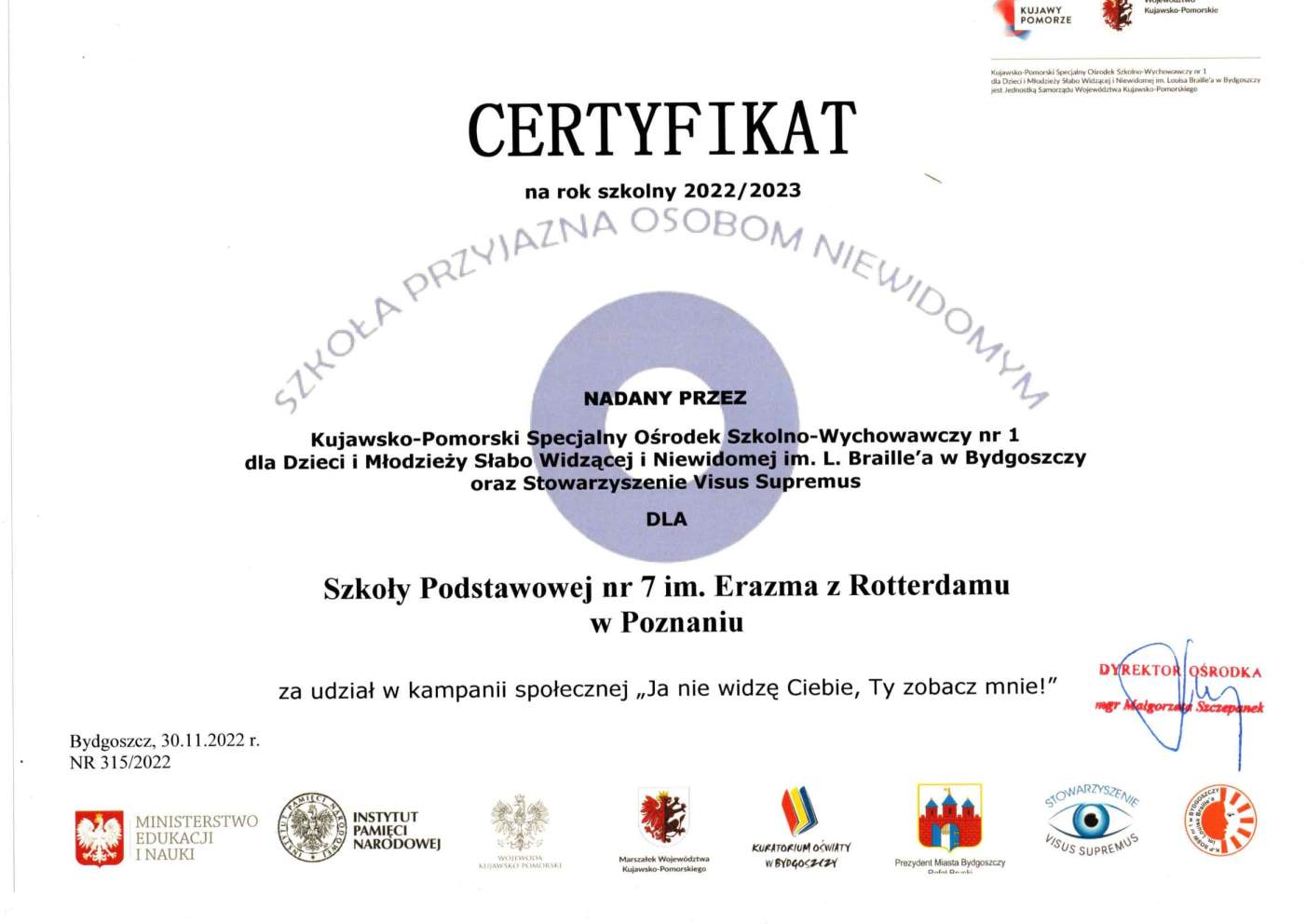 Po raz kolejny zostaliśmy wyróżnieni certyfikatem „Szkoła przyjazna osobom niewidomym”. Na przełomie października i listopada w wybranych klasach zostały przeprowadzone warsztaty przedstawiające uczniom problematykę osób z niepełnosprawnością wzrokową ze środowiskiem ludzi widzących. Warsztatowy charakter zajęć pozwolił uczniom zrozumienie sytuacji osób, którzy innymi zmysłami postrzegają świat, a sami uczniowie mogli przełamać swoje bariery mentalne.