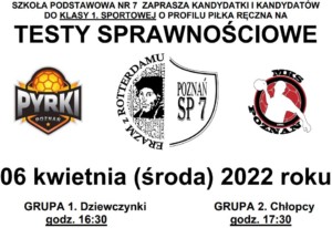 Zapraszamy kandydatki i kandydatów do 1 KLASY SPORTOWEJ o profilu piłka ręczna na próby sprawnościowe, które odbędą się w ŚRODĘ 6 kwietnia 2022r.