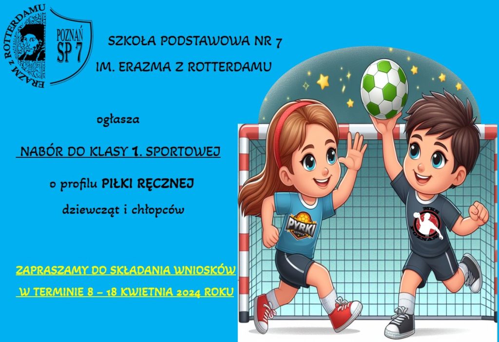 Zapraszamy kandydatki i kandydatów do 1 KLASY SPORTOWEJ o profilu piłka ręczna na próby sprawnościowe, które odbędą się w CZWARTEK 18 kwietnia 2024r.