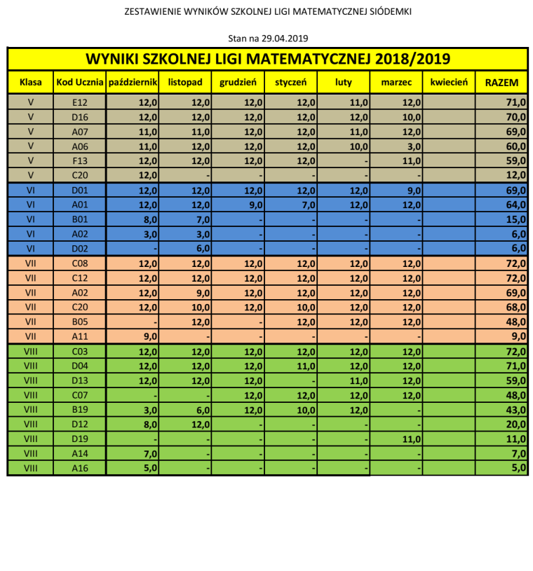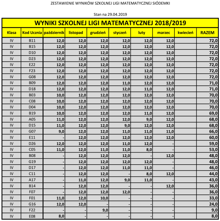 Wyniki po ostatnim miesiącu i wynik zbiorcze zostaną ogłoszone podczas zakończenia roku szkolnego.