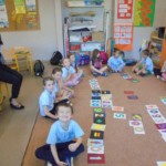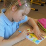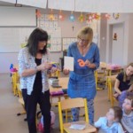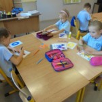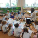 Pani Elżbieta przyniosła na spotkanie i warsztaty z dziećmi egzemplarze książek, które ilustrowała, między innymi Rozwesołki , Rozwesołki drugie oraz Imię to nie fraszka. Przyniosła również plakaty i karty z fragmentami ilustracji w jej wykonaniu pokazujące poszczególne etapy pracy nad tworzeniem ilustracji do książki. Dzieci z uwagą słuchały opowiadania pani Krygowskiej Butlewskiej o współpracy z pisarką książek dla dzieci panią Joanną Papuzińską. Zadawały też bardzo dużo pytań. Mogły z bliska, a nawet z bardzo bliska, bo z pomocą lupy zobaczyć, jak wyglądają poszczególne kreski stawiane na ilustracji. Dzieciom bardzo podobały się różne śmieszne ludziki i zwierzątka. Po wysłuchaniu wierszyków o miesiącach i obejrzeniu do nich ilustracji, jakie wykonała pani Elżbieta same mogły zilustrować cyfry, które tworzą ich datę urodzenia. To zajęcie dało dzieciom dużo radości i okazało się, że wyobraźnia dziecięca nie zna granic, a i konkurencja dla Pani Elżbiety już rośnie. Na koniec uczniowie rozwiązywali zadania matematyczne