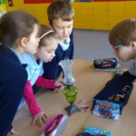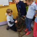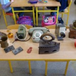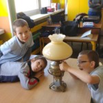 Poznając tematykę związaną z elektrycznością uczniowie z klasy 2c przynieśli do szkoły swoje rodzinne pamiątki z czasów babć i prababć. Wielką radość sprawiła możliwość obejrzenia na własne oczy dawnych urządzeń i porównywanie ich z tymi aktualnymi. Uczniowie mogli zobaczyć: kołowrotek, stary telefon, żelazko na duszę, strugaczkę, młynek do mielenia kawy, kasety magnetofonowe oraz rzutnik do wyświetlania bajek na ścianie. Dzięki mamie i wujkowi Mateusza dzieci dowiedziały się jak kiedyś oświetlano mieszkania, sprawdzały jak wyglądały lampy naftowe oraz miały możliwość posłuchania muzyki z płyty gramofonowej. Dzieciom bardzo podobała się możliwość dotknięcia i przetestowania dawnych sprzętów. Cały tydzień z zaciekawieniem spoglądali na naszą klasową wystawę.