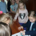 Najpierw zobaczyliśmy skarbiec, do którego prowadziło mnóstwo grubych drzwi. Obejrzeliśmy prezentację o rodzinie Finansiaków. Zostaliśmy poczęstowani owocami i ciastkami. Panie pokazywały nam maszyny, które liczą pieniądze. Poszliśmy do gabinetu dyrektora. Mogliśmy usiąść w fotelu i przybić pieczątkę. Dostaliśmy też długopisy. Na zakończenie każdy z nas wpłacał albo wypłacał pieniądze w bankomacie. Wycieczka bardzo mi się podobała.
